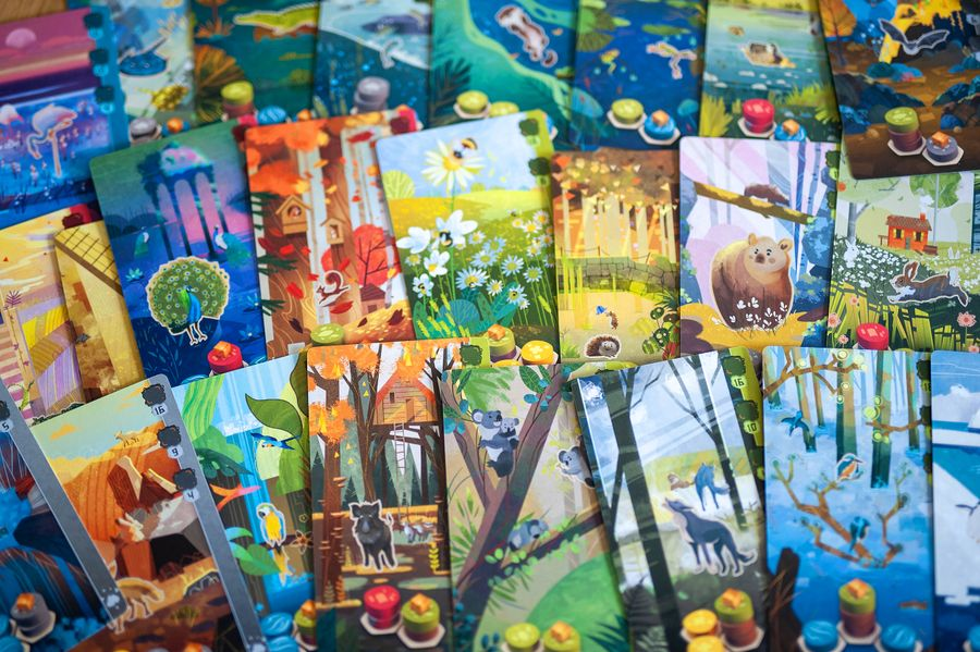 Placement of the terrain tokens will depend on the personal Animal card goals, and scoring rules for the various terrain types (mountain, field, forest, etc). For example, mountain tiles score based on how high they are (1 tile scores 1, while 3 tiles stacked score 7), but the mountain scores zero if it is not adjacent to at least one other mountain. If all the cubes on a given Animal card have been placed, the card is set aside and a new card can be drawn. The cards are scored at game end based on the highest number that isn’t covered by a cube.