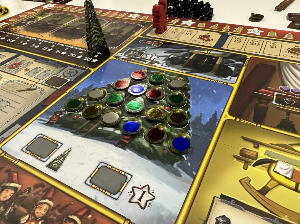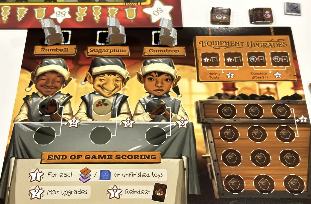 This game is dripping with theme as they say… from the Reindeer Stables to the Mailroom with all the letters from Santa (with the toys you have to build on one side) to the Coal Mine which is the games currency (and for the kids on the Naughty List) to the Material Locations where you swap coal for the fabric, wood and metal necessary to build the toys, etc… the game takes place on the 9 days before Christmas and every 3 days Santa comes through and does an inspection to see which team of elves has the most Christmas Cheer (who completed the most toys and hung the most ornaments on the workshop’s tree)… in the end, the team that has the most points (most cheer), joins Santa on an after-Christmas vacation someplace warm and sunny… the artwork is amazing and the gameplay, while having a lot going on compared to what I was anticipating, was fun and thinky (there is a Basic set of rules and it’s own game board on the opposite side of the main board)…