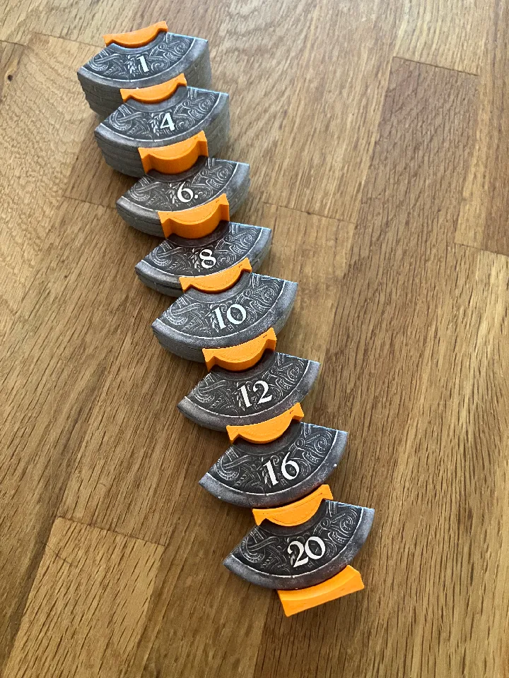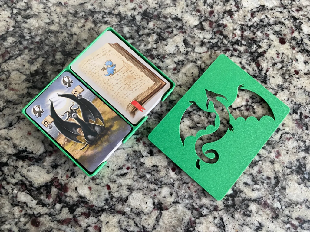 A while back I was playing a game of Dragonkeepers and wished I had a better way to hold the two decks of cards… and the stacks of amulet pieces were always falling over and requiring attention… I found a couple free solutions online and asked our elementary tech teacher at school if she could run them off for me… she did and they are amazing!! I can’t thank her enough!! They really clean up the table during play and are a fantastic upgrade.