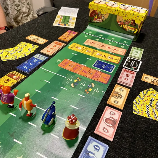 (From BGG): Hot Streak is a game for hard luck gamblers who love to bet on and scream at the racers, who in this case happen to be mascots who may (or may not) keep running in the right direction.