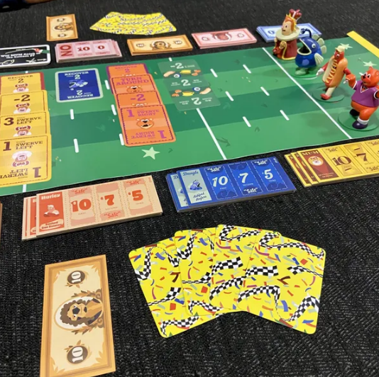 Shuffle the deck, burn three cards, then reveal cards one by one from the deck, moving the mascots along the track, with them sometimes swerving into another lane and knocking over another racer, sometimes turning around, sometimes all moving at once, and sometimes just going backwards! If a racer runs off the track or would be knocked over while already fallen, they’re disqualified. If needed, shuffle all cards in the deck, burn three cards again, and keep racing until all four spots on the box podium are filled. Pay out bets based on these results.