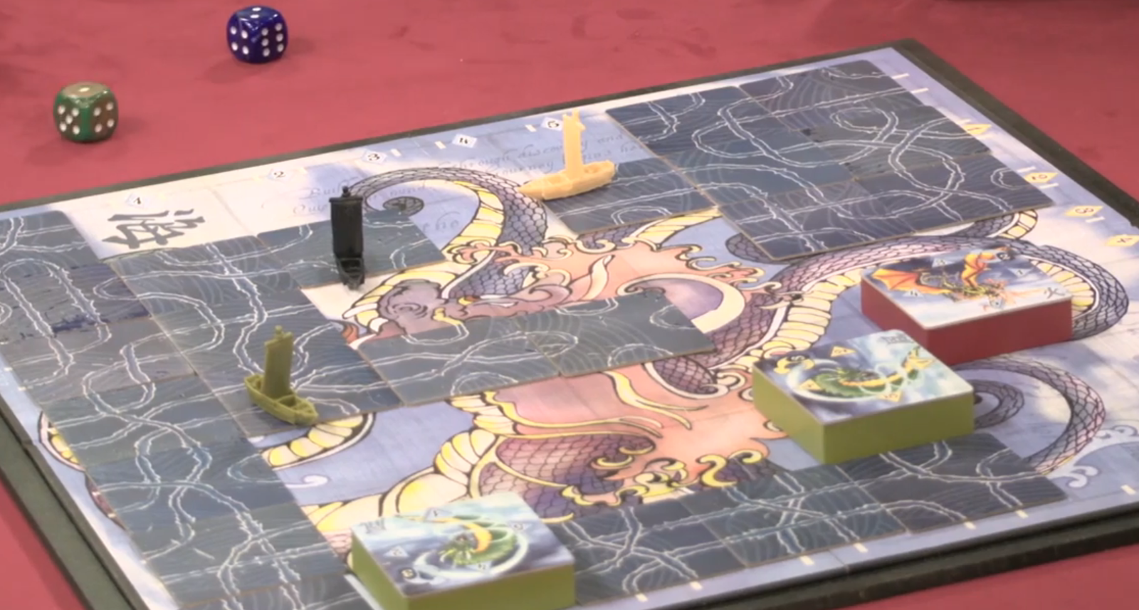 The game has players laying route tiles and moving their ships while trying to avoid dragon tiles… in Wil’s video, the dragons were raised on wood blocks… aside from looking cool, it was very functional to the game as, at various points, the dragon tiles needed to be picked up, rotated or moved – all without hopefully disturbing adjacent tiles…